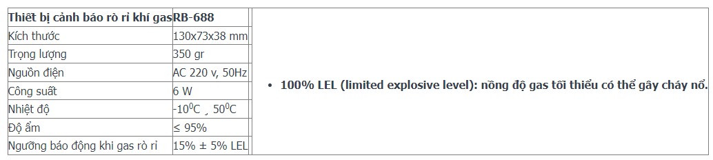Cảnh báo gas (LPG) rò rỉ. Ngưỡng cảnh báo 15% + 5 % LEL
